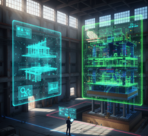 鹿間工業は、木ではなく鉄を使って、高層ビルやショッピングセンター大型倉庫など、もっと大きな建物を作っているのです。