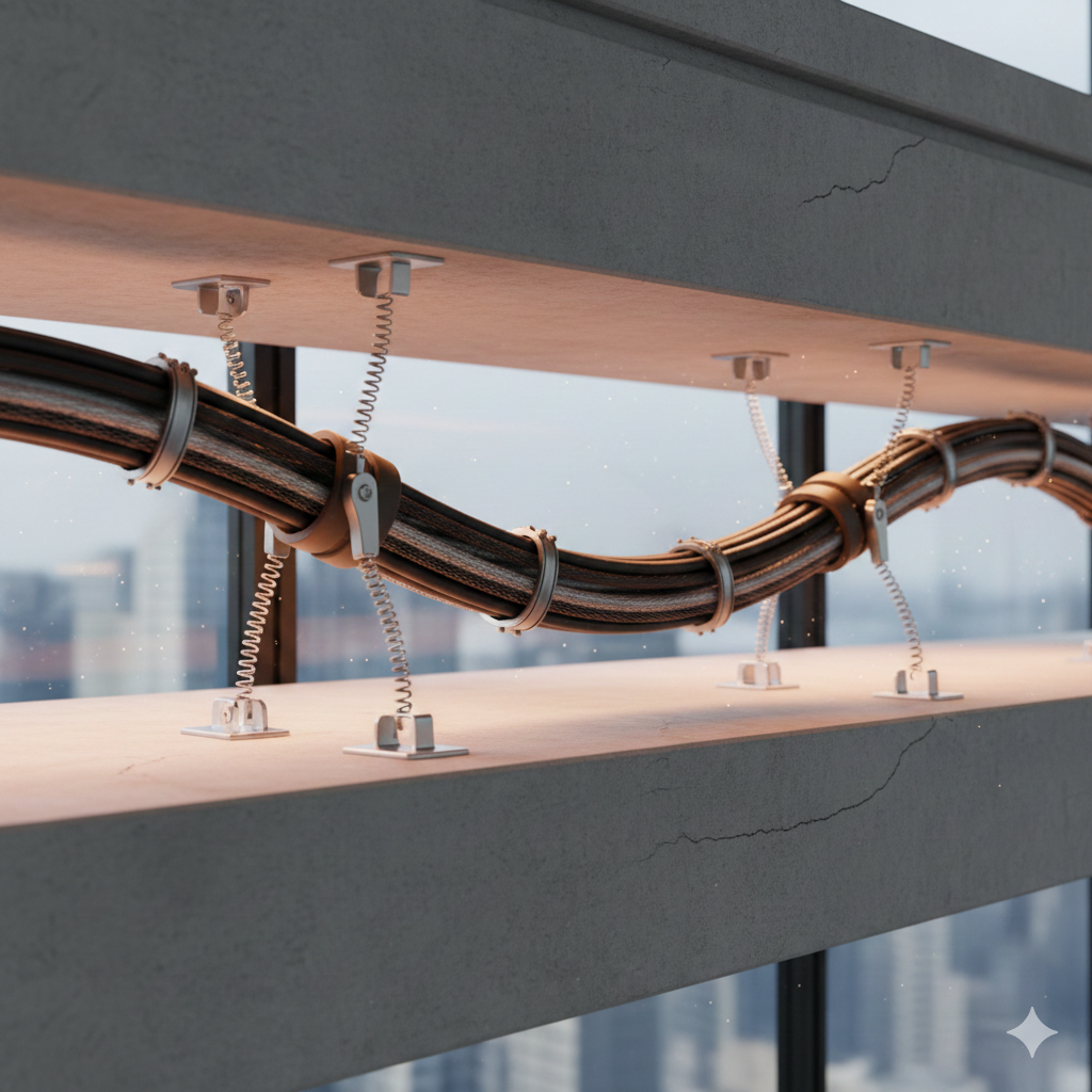 建物が揺れる際、構造体は数センチから数十センチの幅で変形します。これに対して配線や配管が「カチカチ」に固定されていると、揺れに追従できず、引きちぎられたり、接続部が損壊したりします。本記事では、インフラの命綱を守るための最新の支持技術と、耐震診断におけるチェックポイントを解説します。