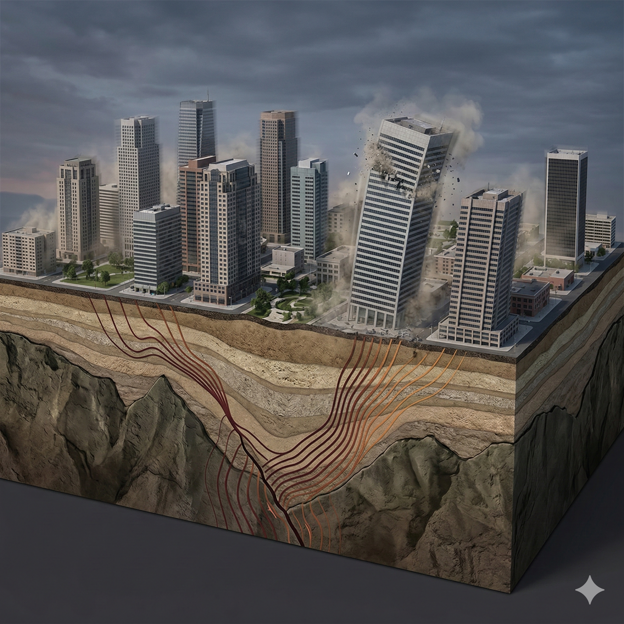- 超高層ビルとのマッチング 深い堆積層(関東平野や大阪平野など)は、数秒から十数秒の「長い周期」の波を増幅させます。これが超高層ビルの固有周期と一致(共振)すると、最上階の揺れ幅が数メートルに達し、構造体が致命的な損傷を受けるリスクが生じます。