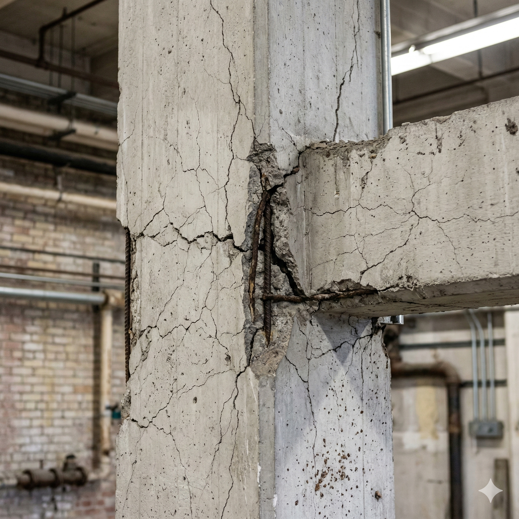 - コンクリートのひび割れ増殖(微細クラック) 目に見えないほどの微細なひび割れが、繰り返しの振動でつながり、太い「通り道」となります。ここから中性化が進み、鉄筋の腐食を加速させます。