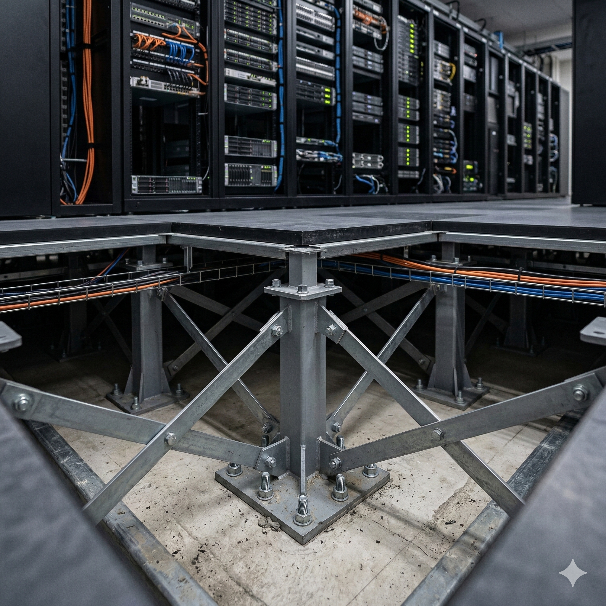 🏗️ 「サーバーフロアの二重床」の転倒対策:データセンター機能を停止させないための、支持脚の耐震固定