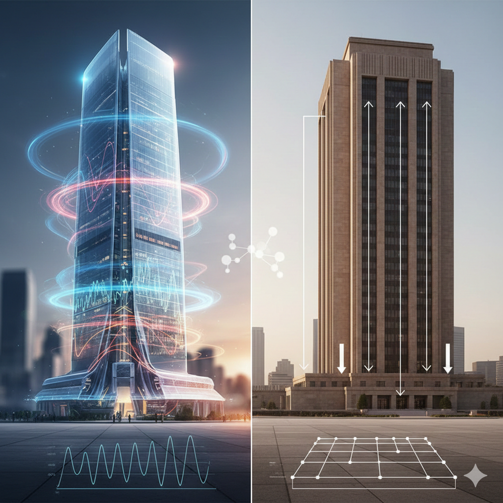 一般的な中低層ビルであれば静的解析で十分な場合が多いですが、高層ビル、大規模工場、複雑な形状の建築物では、動的解析を用いなければ真の地震リスクを見誤る可能性があります。本記事では、これら2つの手法の決定的な違いと、使い分けの判断基準について解説します。