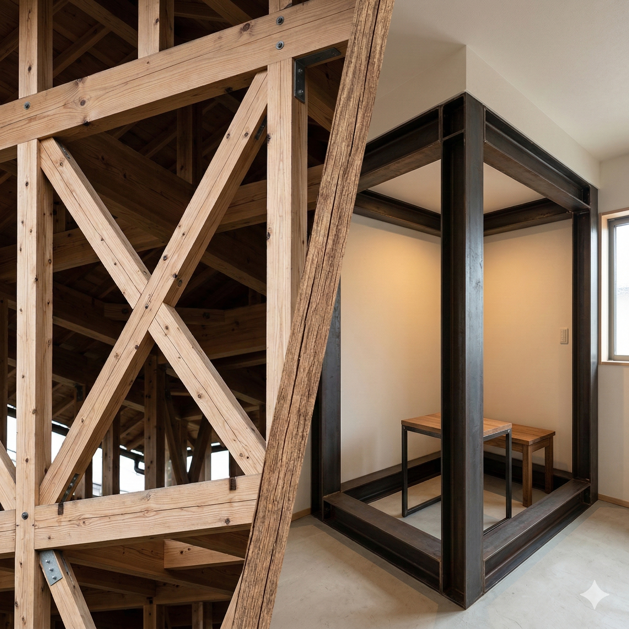 耐震性能が不足している古い建物において、対策の選択肢は大きく二つに分かれます。建物そのものを強くする**「構造補強」か、万が一の倒壊時に命を守る空間を確保する「耐震シェルター(部分補強)」**か。