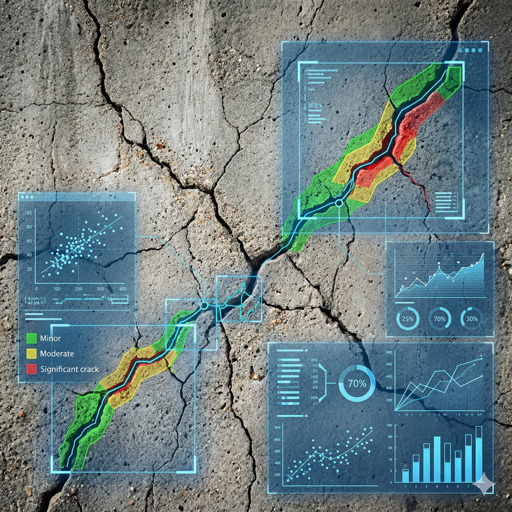 ひび割れの「パターン」をAIが解析することで、それが単なる乾燥収縮によるものか、あるいは地震や不等沈下による「構造的な歪み」によるものかを推論し、耐震診断の精度を向上させます。