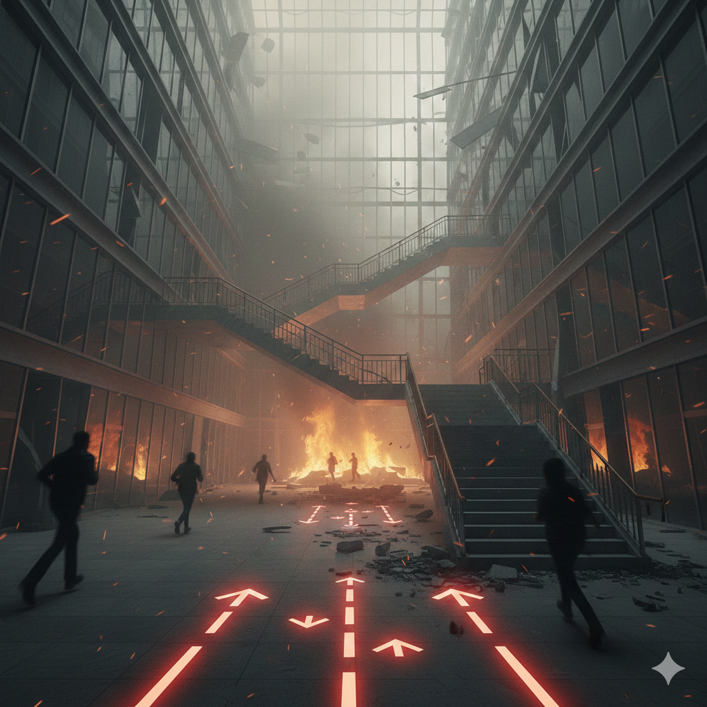 地震火災において、建物が倒壊しなくても、安全に避難できなければ人命保護は達成できません。避難経路の安全性は**「構造体の安全」と同等に重要**です。